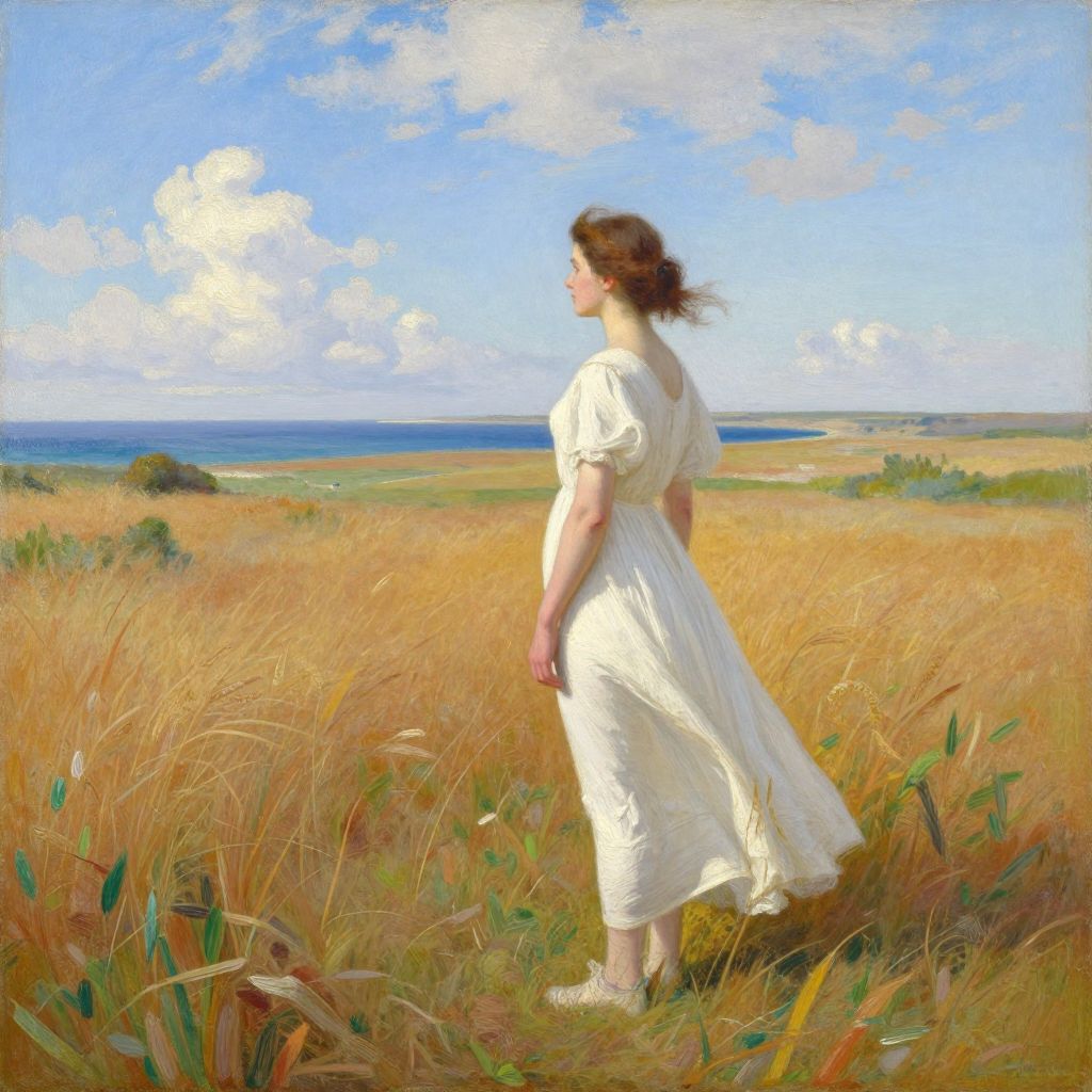 A serene oil painting by Charles Courtney Curran captures a woman in a flowing white dress standing amidst a vibrant field of golden grass, her gaze directed toward a tranquil coastal landscape under a bright blue sky dotted with fluffy clouds, showcasing the artist's masterful use of light and texture to evoke a sense of peaceful solitude.