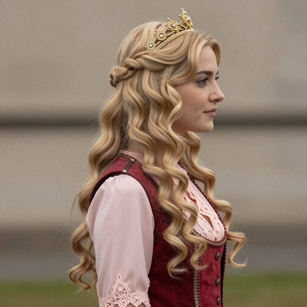 Photograph of a woman in profile, wearing a pink, lace-trimmed blouse and a red vest. She has long, wavy, blonde hair with a golden crown headpiece. The background is blurred, highlighting her detailed, vintage-style attire and hair.