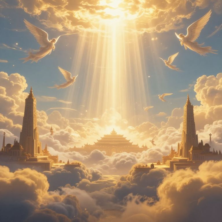 Heavrn depicted as a luminous celestial realm with vast golden clouds and radiant beams of light piercing through a serene sky, ethereal angelic figures floating gracefully among ancient majestic temples, mystical and tranquil atmosphere, ultra-detailed fantasy landscape