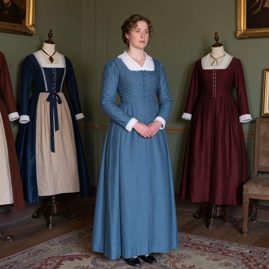 Historic reenactment clothing, woman in a blue dress standing in a room