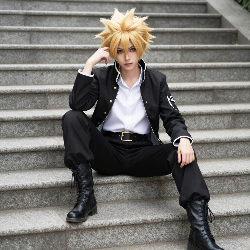 Photo-realistic cosplay photo of person standing in monoyoshi sadamune costume. 1boy, yellow eyes, blonde hair, pantyhose under shorts, lace-up bootsfull body shot. lifestyle stock photo, shallow depth of field, lifestyle stock photography, shallow depth of field, natural lighting, warm tones, soft background blur, vibrant colors, realistic textures, professional photoshoot