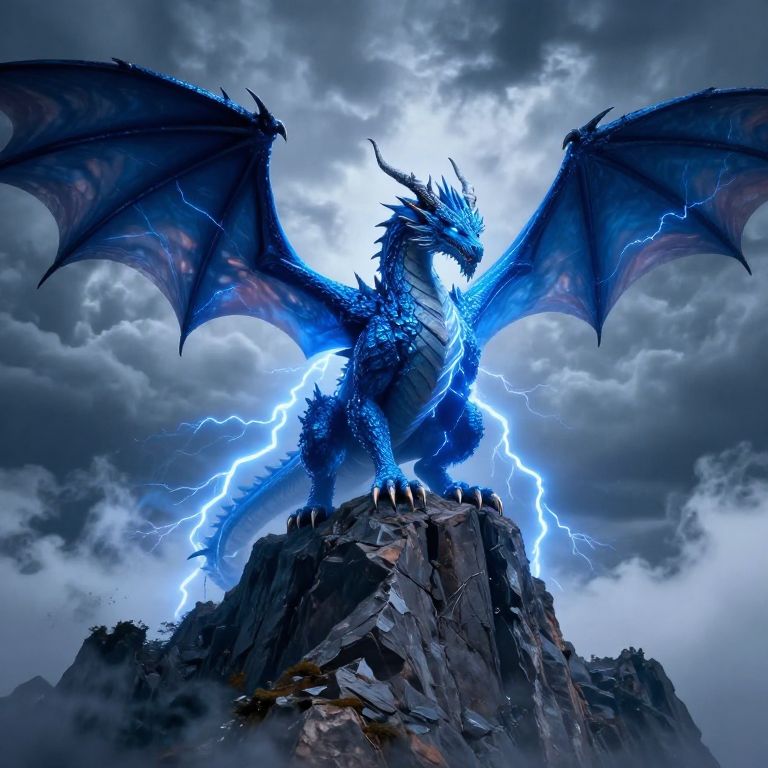 Digital artwork of a fierce blue dragon with glowing lightning, standing on a rocky peak, wings spread wide, against a stormy sky.