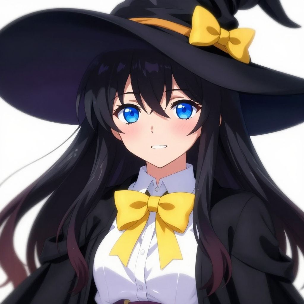 Digital anime-style drawing of a cute blonde girl with blue eyes, wearing a witch hat, black dress with white frills, yellow bow, and gold