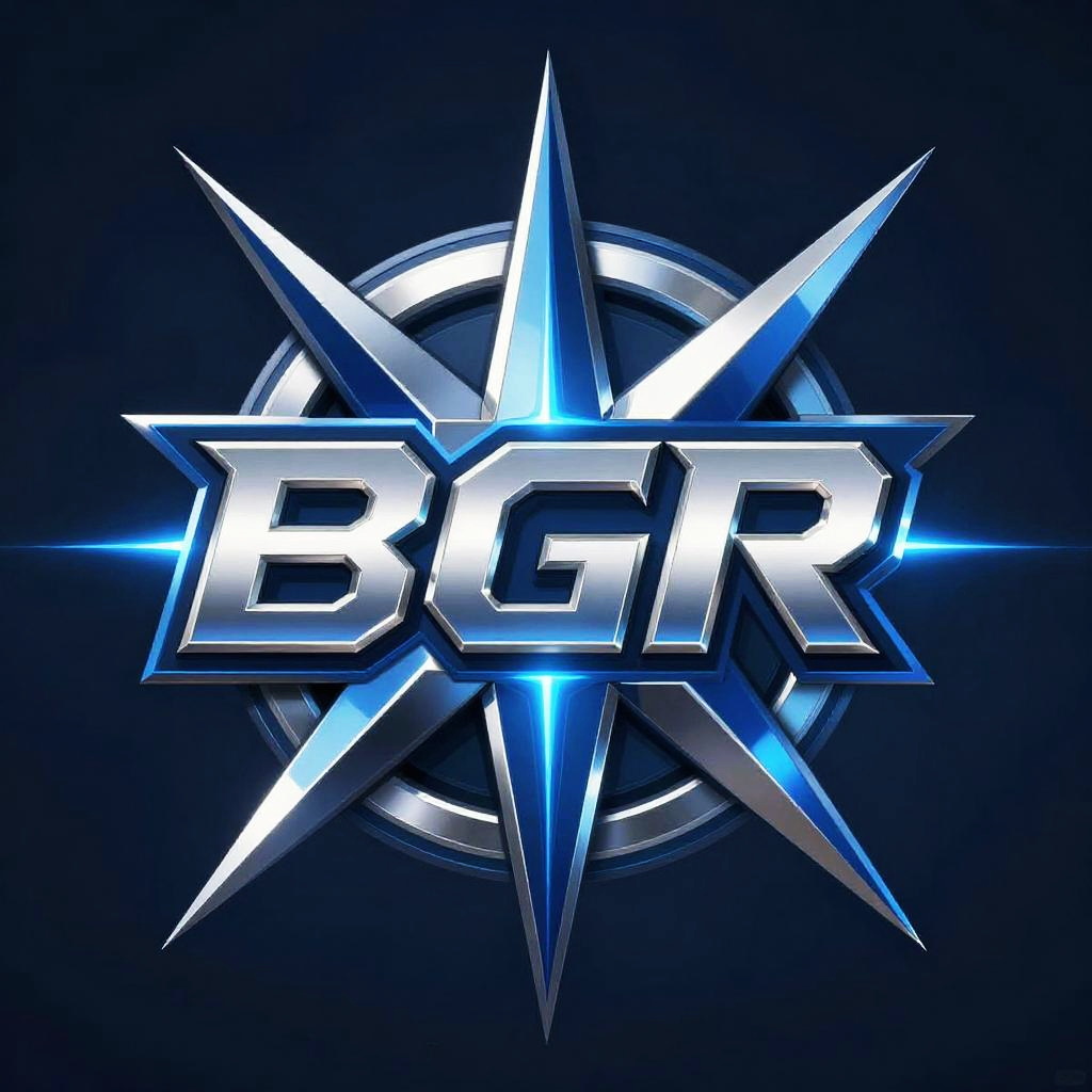 Bgr logo, abstract and dynamic composition with sharp angular lines and glossy metallic finish, electric blue and silver tones, glowing neon accents
