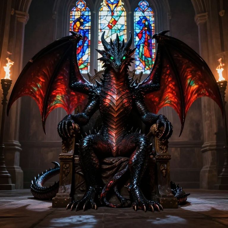 A photorealistic portrait reminiscent of Rembrandt's masterful compositions, this depiction captures a fierce dragoness seated upon her throne in an atmospheric medieval hall. The dragoness's obsidian scales shimmer with vibrant intensity under the dim torchlight, casting a long shadow across the stone floor. Her piercing emerald eyes hold an inner fire that seems to ignite the room, while her wings are folded gracefully behind her, their iridescent sheen reflecting the flickering light. A grand stained glass window frames her majestic form, its prismatic rays bathing her in an ethereal glow that evokes a sense of awe and reverence in all who behold this powerful yet noble creature.