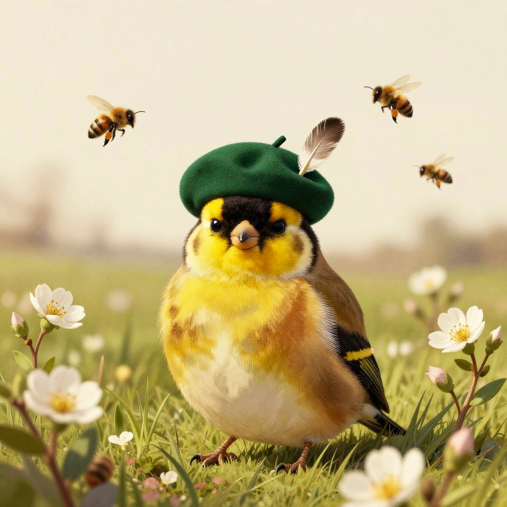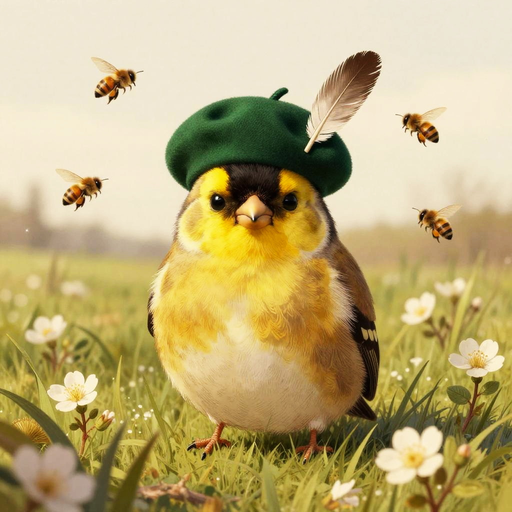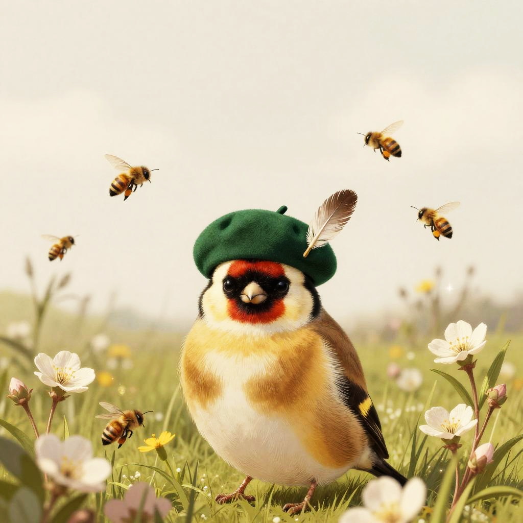 A bashful goldfinch wearing a petite emerald green beret with a feather pin, set in a flowering meadow under an overcast spring sky with buzzing bees, vintage illustration aesthetic with delicate linework and fine crosshatching, muted warm palette on a soft cream backdrop, ornate botanical detailing, gentle and charming atmosphere, soft rim lighting, subtle paper grain texture, balanced and symmetrical composition, slight vignette, natural bokeh sparkle, ultra clean edges, high fidelity details