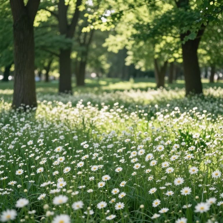 Sunlight filters through verdant trees, casting dappled shadows over a vibrant meadow dotted with countless white daisies, creating a serene and ethereal atmosphere.