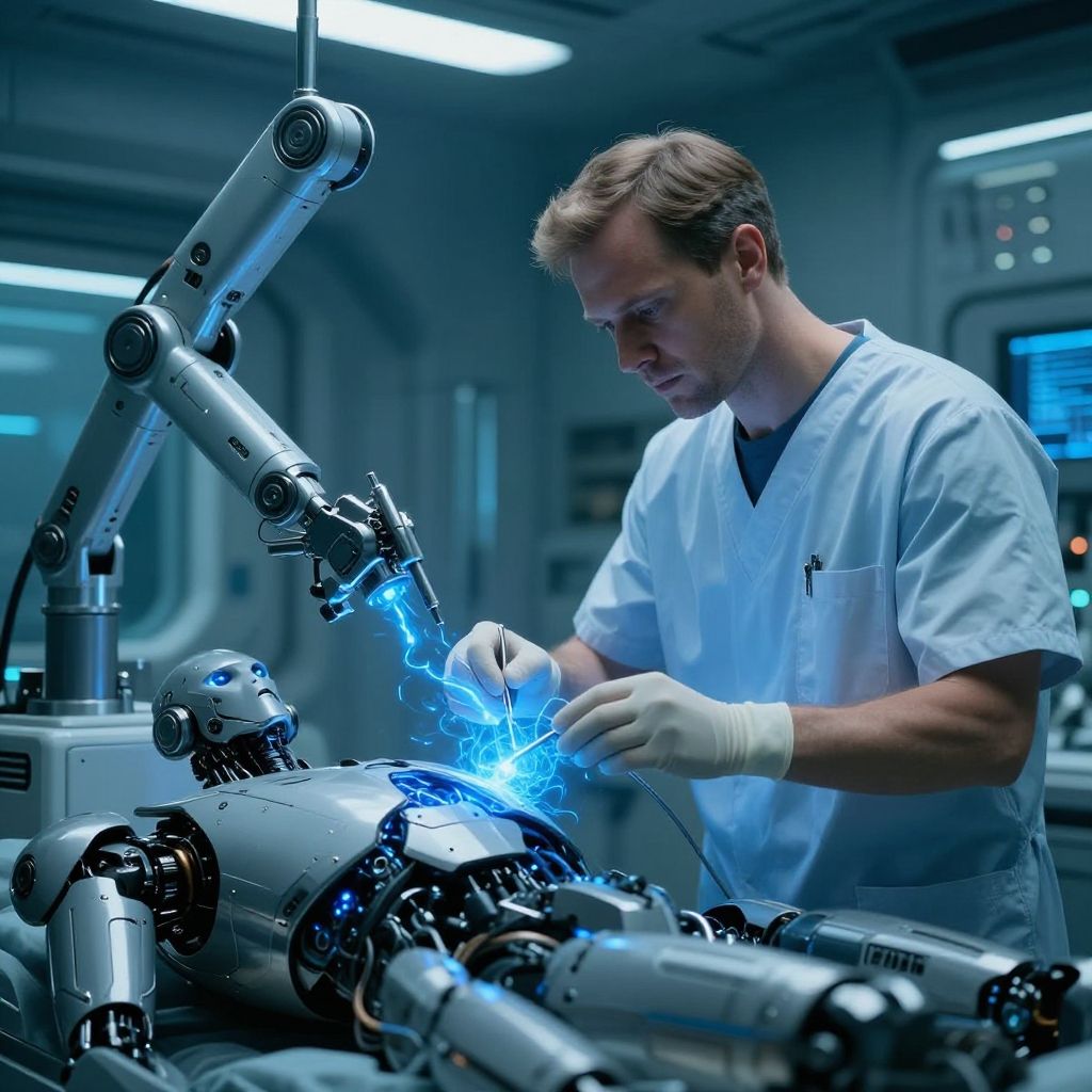 Sci fi medic attending to injured android, sterile spaceship infirmary, intricate robotic tools with blue energy, cyberpunk aesthetic, illuminated panels, intense focused expression
