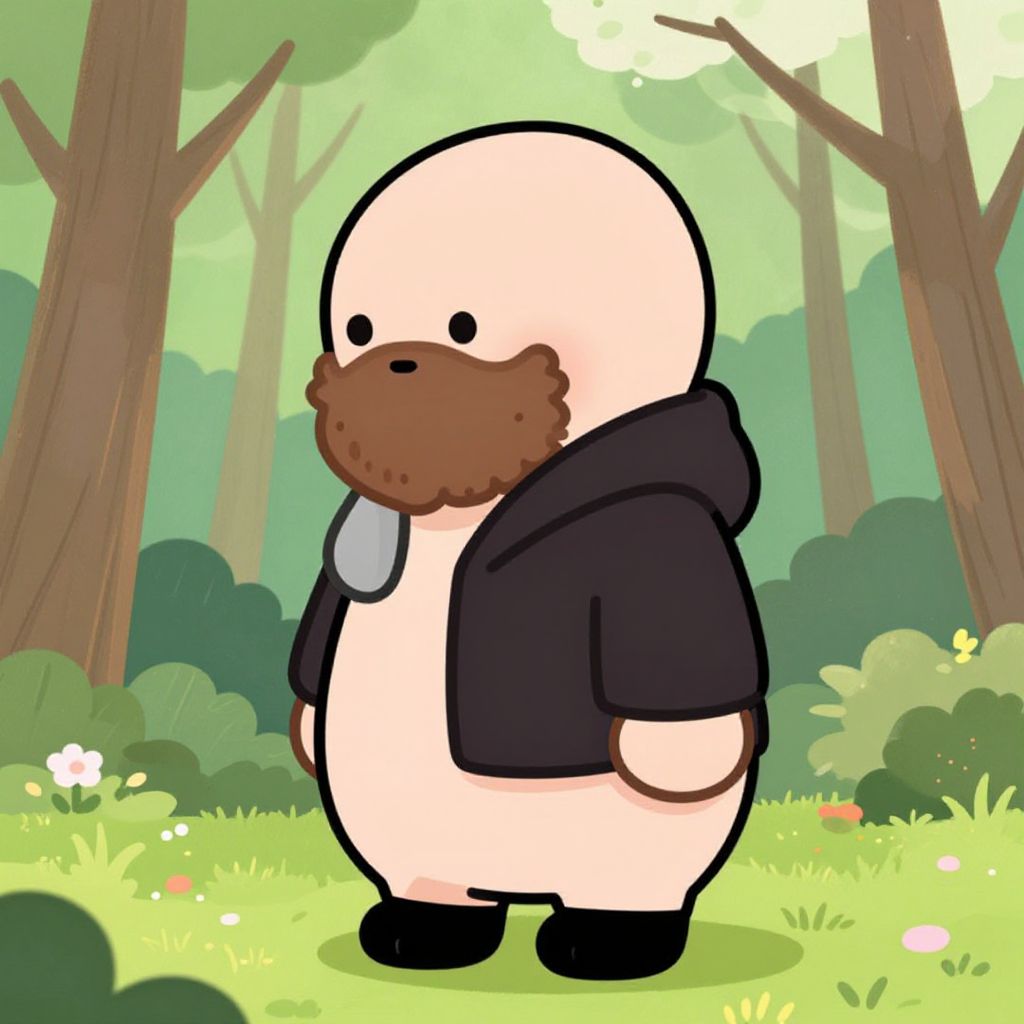 A digital cartoon illustration of a bald, bearded man standing in a lush forest. He has a large, white shirt with a black short-sleeved shirt over it and black pants. His skin is light, and he has a round face with simple black eyes and a small nose. The background features tall trees with brown trunks, green foliage, and bright green grass with small pink and white flowers. The light filters through the trees, creating a serene, sunny atmosphere. The style is colorful and minimalist with smooth lines and bold colors.