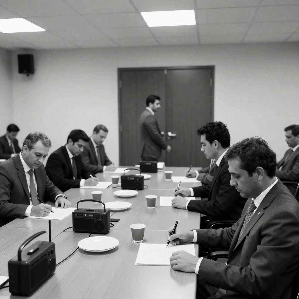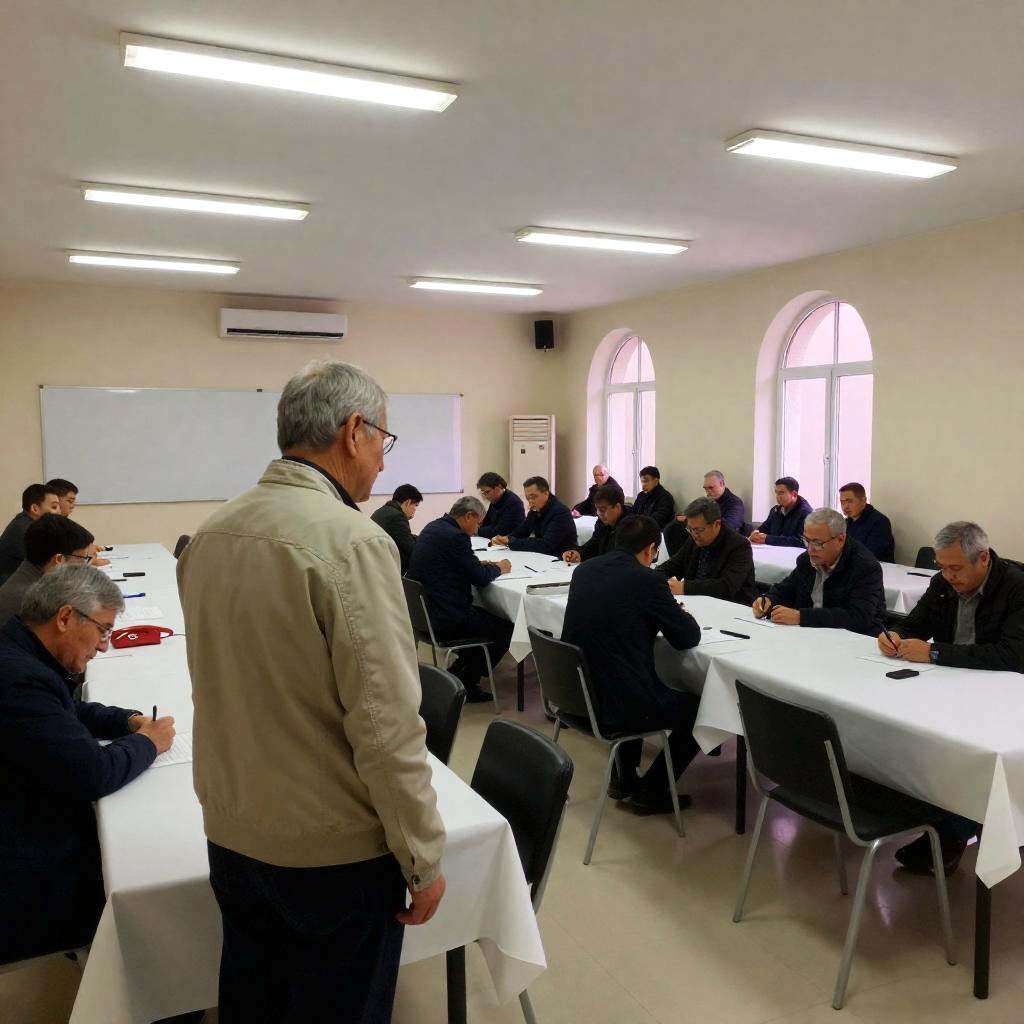 A group of mostly middle-aged and elderly men gathered in a large conference room with long tables covered in white tablecloths and black chairs. One older man in a beige jacket stands in the foreground, while others are seated and writing or conversing. The room is illuminated by fluorescent lights and features arched windows with a pinkish light outside. A whiteboard and a red phone are visible on the left wall.