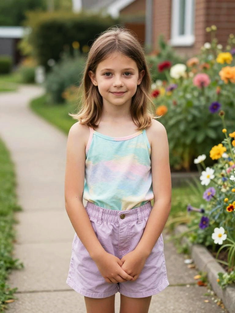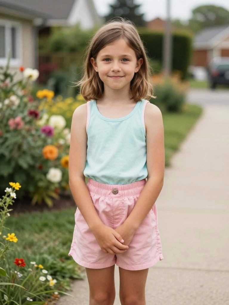 9 years old girl lifestyle photo, olive-skinned girl with dark blonde hair and bright eyes wearing pastel tank top with high-waisted shorts, standing on a path next to a flower garden, hands gently clasped in front of her, smiling at the camera, soft depth of field with colorful blooms and greenery behind her, quiet neighborhood path edged with wildflowers and grass