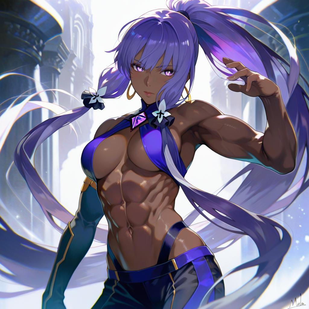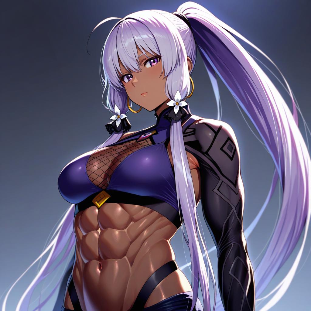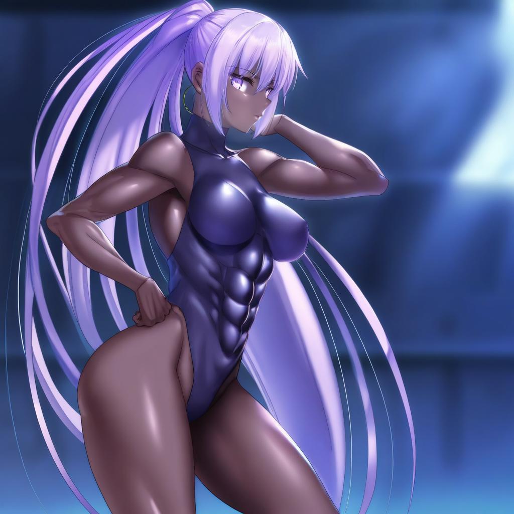 Assassin (fate/zero), fate (series), 1girl, dark-skinned female, grey skin, very dark skin, purple eyes, purple hair, very long hair, long hair, ponytail, medium breasts, hoop earrings, abs, muscular female, by artist kokuchuutei, illustrious