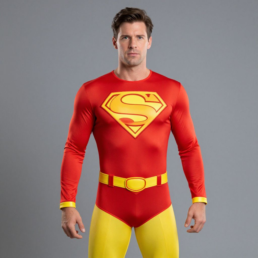 Photograph of a muscular, light-skinned man with short, dark brown hair, wearing a bright red, long-sleeve Superman costume with a yellow "S" emblem on the chest, yellow belt, and yellow pants. His expression is neutral, and he stands against a plain grey background. The costume is form-fitting, highlighting his toned physique. The colors are vibrant, with the red and yellow contrasting sharply. The lighting is even, emphasizing the costume's texture and the man's defined muscles.