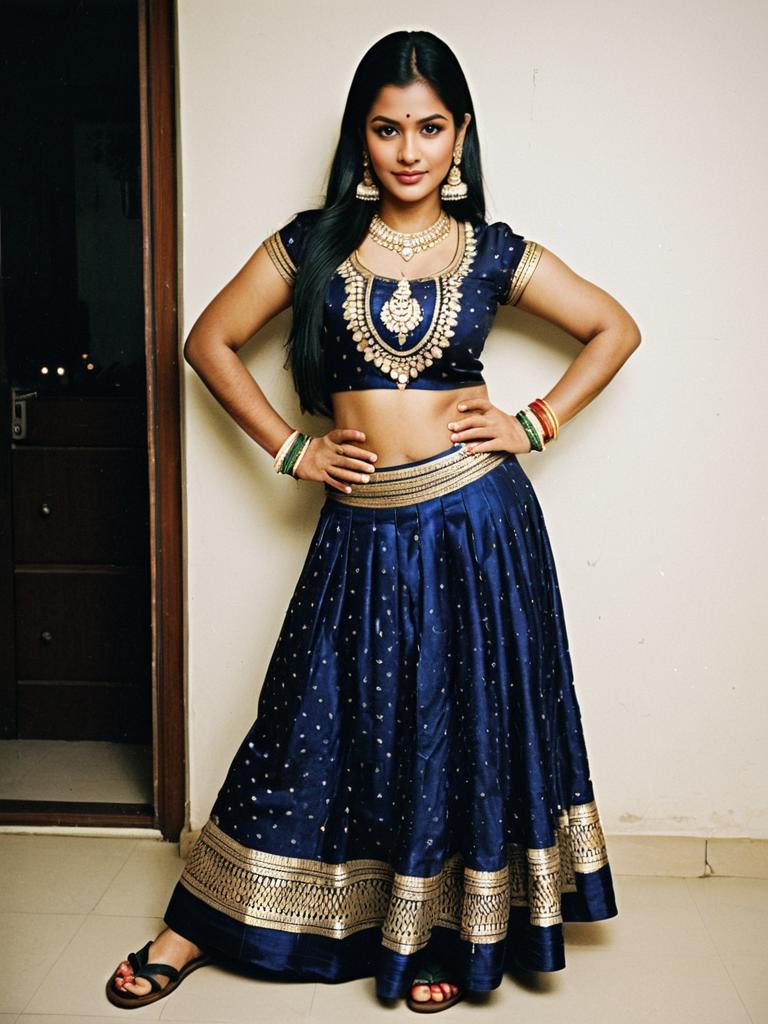 Diwali outfit costume, solo, 1girl, jewelry, black hair, long hair, earrings, realistic, necklace, sandals, arms behind back, full body, standing, skirt, long skirt, bindi