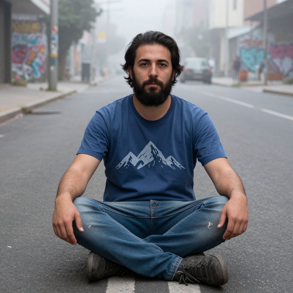 Photograph of a bearded man with medium-length black hair, sitting cross-legged on a foggy, empty urban street. He wears a blue T-shirt with a white mountain graphic and blue jeans with slight rips, along with black sneakers. The background shows graffiti-covered buildings and a blurred, misty street, adding a gritty, urban feel. The man's expression is neutral, and he gazes directly at the camera. The street's asphalt and white lines are visible, emphasizing his central position in the frame. The overall mood is calm and contemplative.