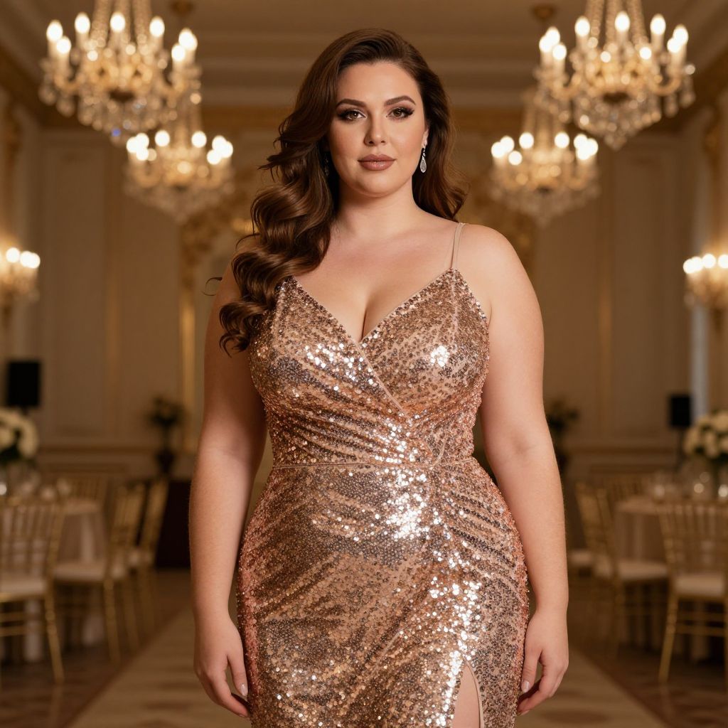 A confident plus size woman with full curves and sparkling plus size sequin evening costume stands in a glamorous, dimly lit ballroom with crystal chandeliers and soft golden lighting. She has long wavy brown hair, warm brown eyes, and a serene expression, wearing a floor-length sequin dress that glimmers under the spotlight, the sequins catching the light in a mesmerizing pattern.. The woman has big tits and cute face