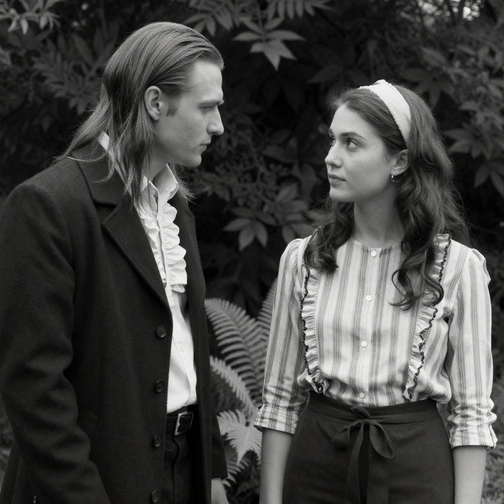 Black-and-white photograph of two people. Man with long, slicked-back hair in a dark coat with ruffled shirt, looking at woman. Woman with hair in a headband, striped blouse with ruffled trim, looking back at man. Dense foliage background. Man leaning slightly forward, woman standing straight. Both have neutral facial expressions. Ferns visible at bottom.