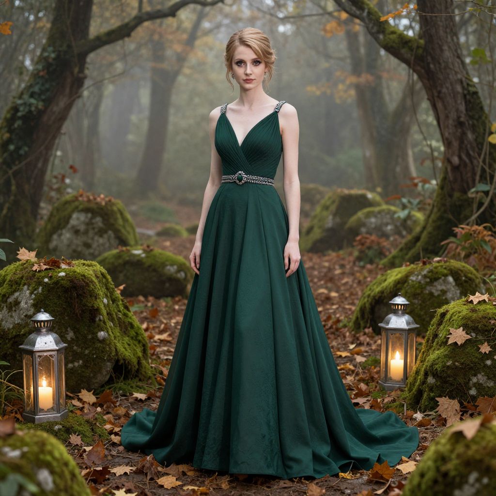 A modern yet classic bride with a porcelain complexion and expressive dark brown eyes dressed in a flowing forest green wedding costume, standing in a fairy-tale forest clearing with moss-covered stones and glowing lanterns, surrounded by autumn leaves and soft morning fog
