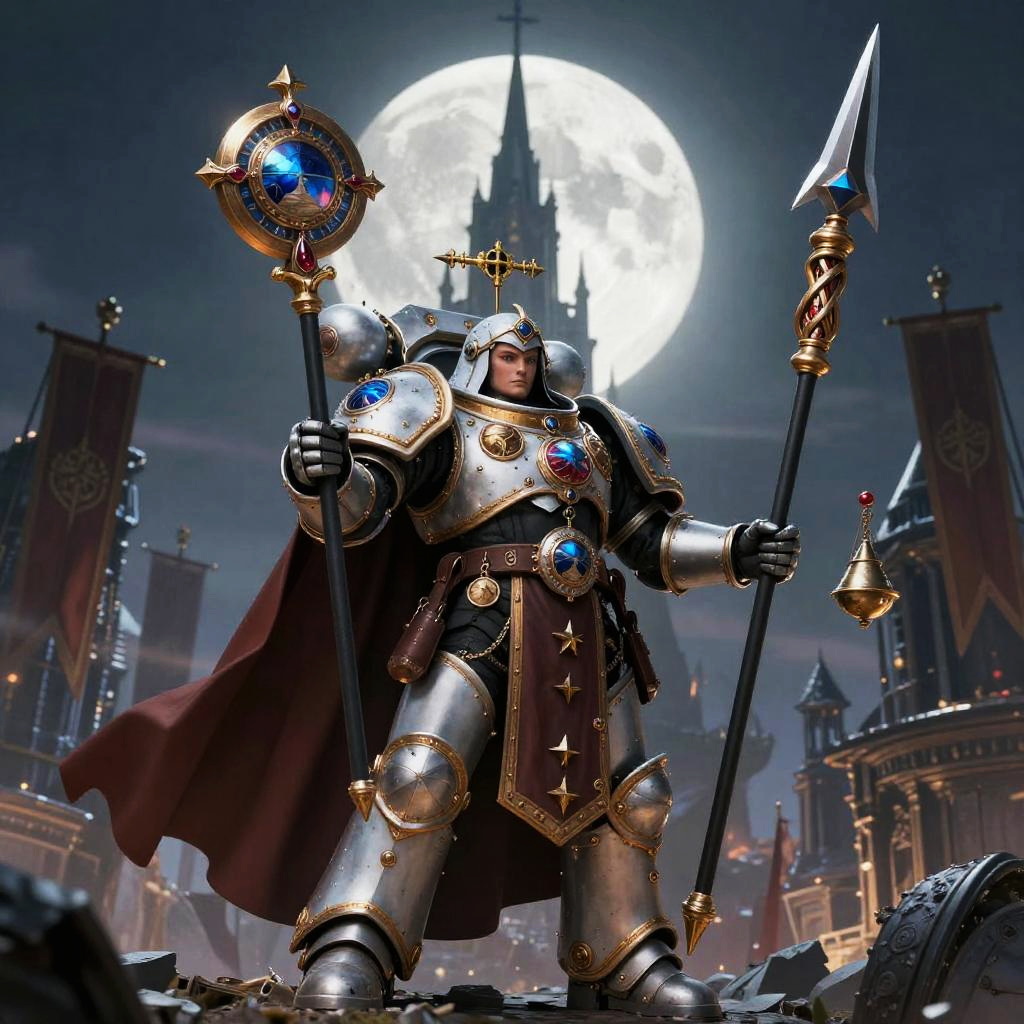 Heroic image of a Sister of Battle (Adepta Sororitas), wearing ceremonial baroque power armor encrusted with relic icons and hanging censers, holding relic-encrusted storm bolter with sacramental bayonet, amidst a moonlit spire overlooking a conquered hive city, banners snapping in the wind.