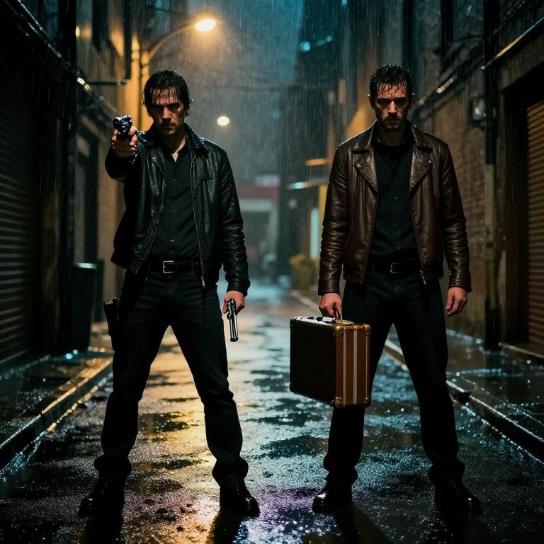 Gangster prompt free: A cinematic standoff between two gangsters in a rain-soaked alley, one holding a pistol, the other with a stolen briefcase. Streetlights flicker, wet surfaces reflect the scene. Urban decay, high contrast, dramatic shadows, realistic textures.