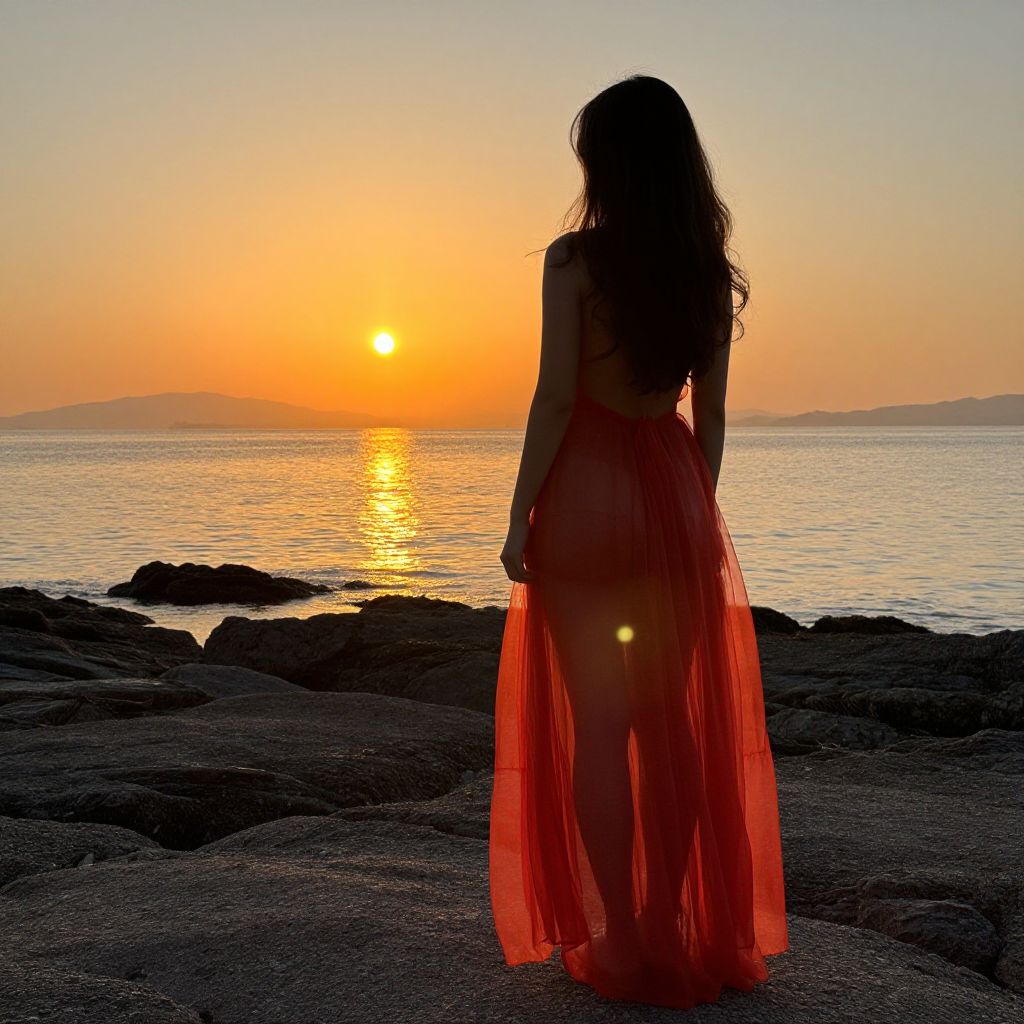 A photograph of a woman with long, wavy hair standing on a rocky beach at sunset. She's wearing a flowing, red, sheer dress that glows against the golden light. The sun is low on the horizon, casting a warm orange and yellow glow over the calm water and dark rocks. She's facing the sea, silhouetted against the vibrant sky.