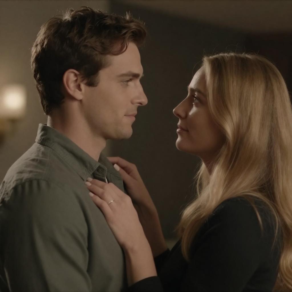 Photograph of a man and woman in a dimly lit room. Woman with shoulder-length brown hair, red top, holding a lit candle. Man with short brown hair, blue checkered shirt, looking at her. Candlelight illuminates their faces. Woman's intense gaze. Man's focused expression. Candle centered between them.
