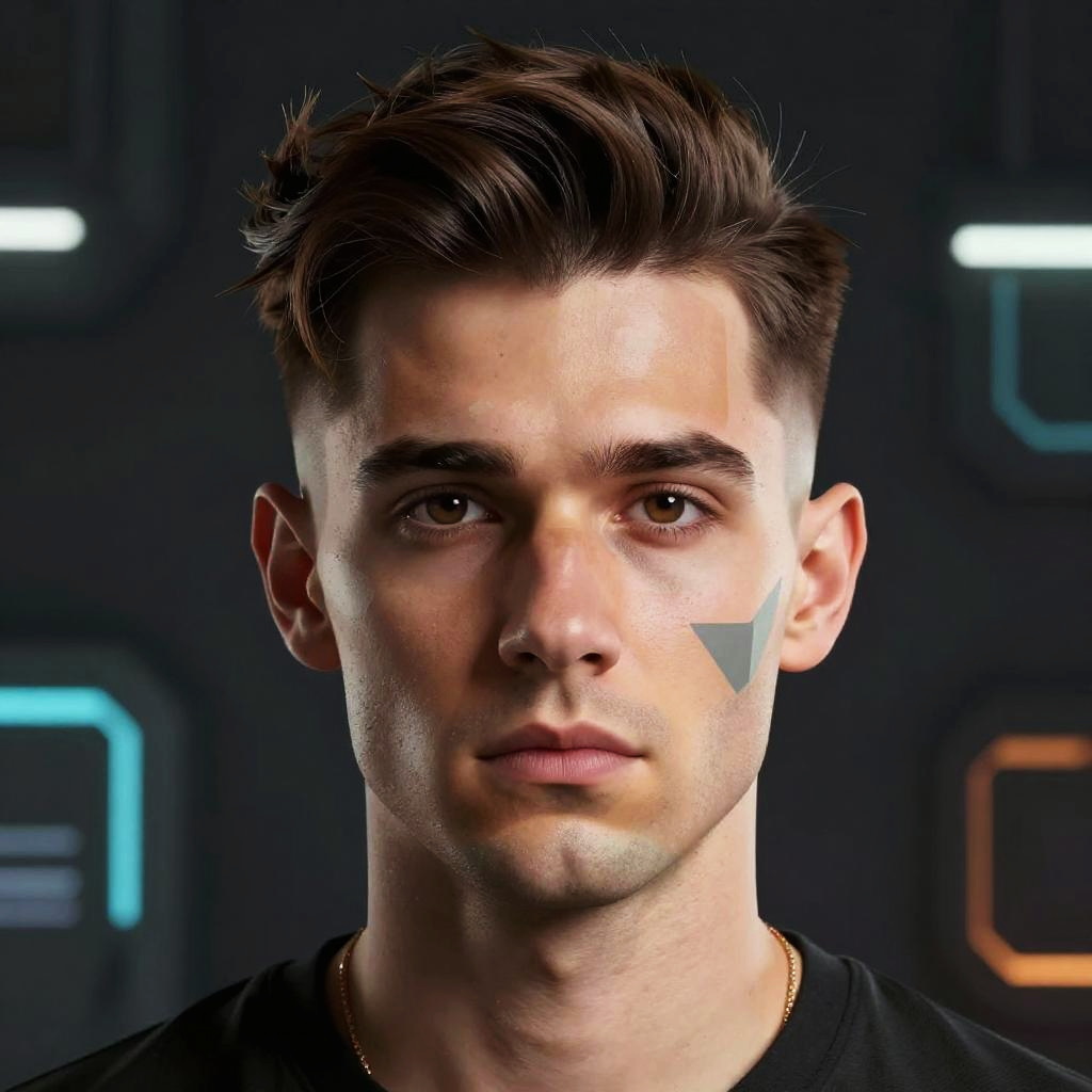 Creative depiction of AI buzz cut filter effect on a diverse group of faces, sharp geometric lines defining the haircut, glowing animated pixels around edges, dynamic lighting with a sci-fi vibe, futuristic user interface elements floating around the subjects.