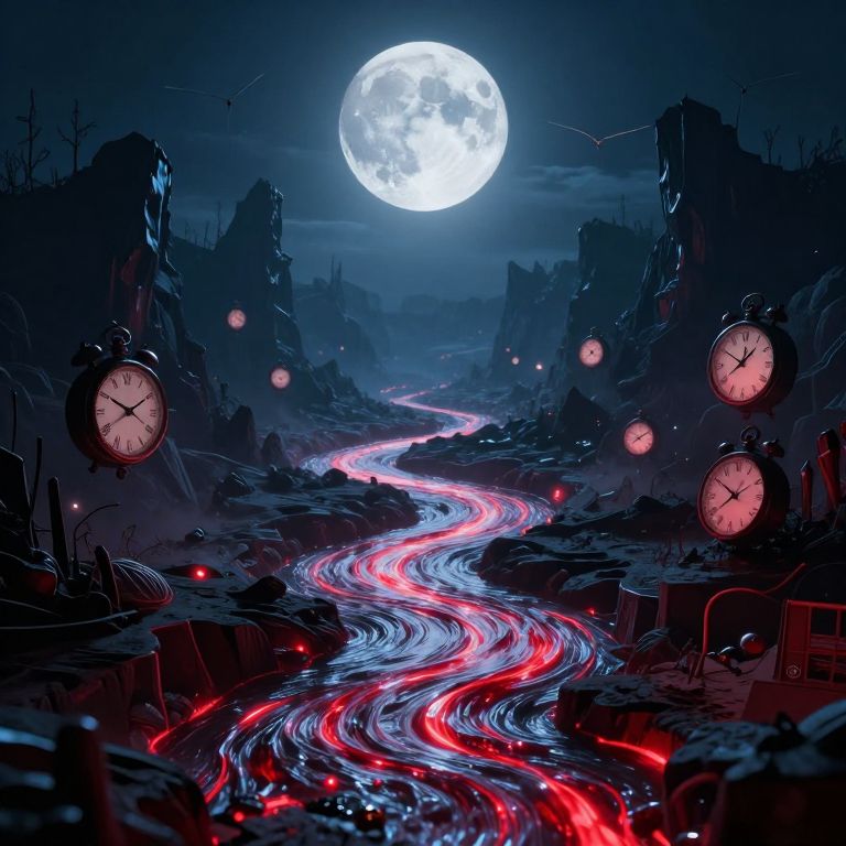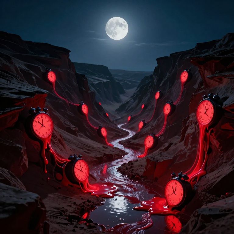 Neon rivers of melted clocks erupt from the ground in a scorched dreamscape, flowing backwards uphill and pooling into puddles of forgotten moments.