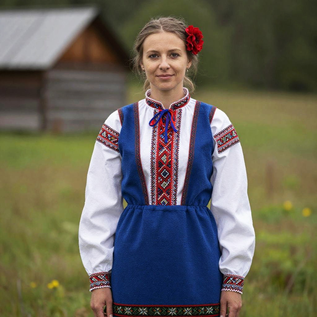 Woman in Slavic Folk Dress with Red Flower