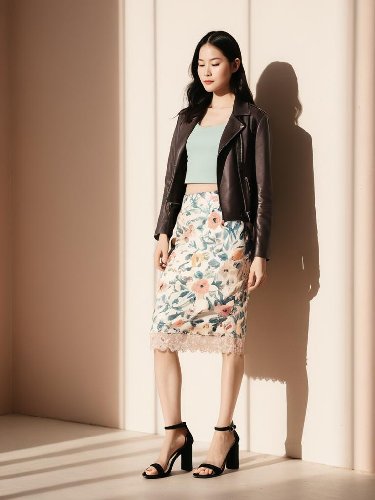 Portrait of an Asian woman wearing a black leather biker jacket over a light pink cropped tank top paired with a high-waisted, knee-length floral pencil skirt featuring red and green flowers and a lace hem. She completes her outfit with black ankle strap heels, standing against a white studio background.