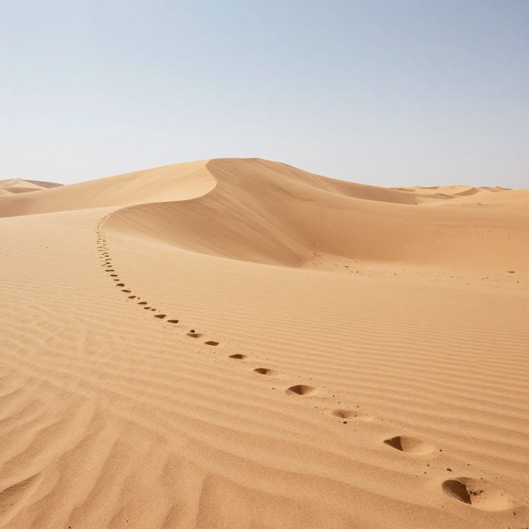 A desert stretches infinitely in every direction except up, where a single man rides a camel across a floating patch of sand shaped like a handkerchief.