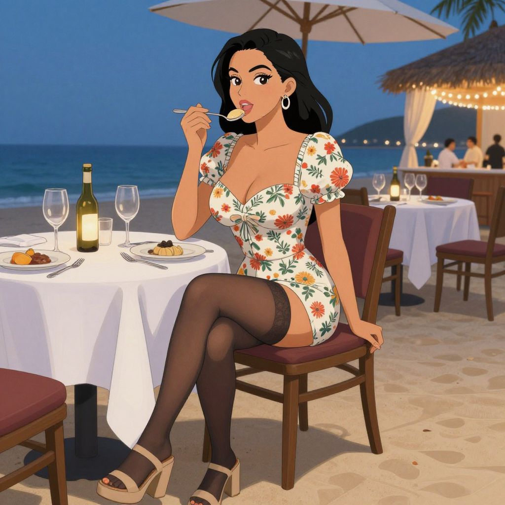 Digital illustration of a curvy woman with black hair, floral dress, black stockings, and heels, dining at a beachside restaurant.