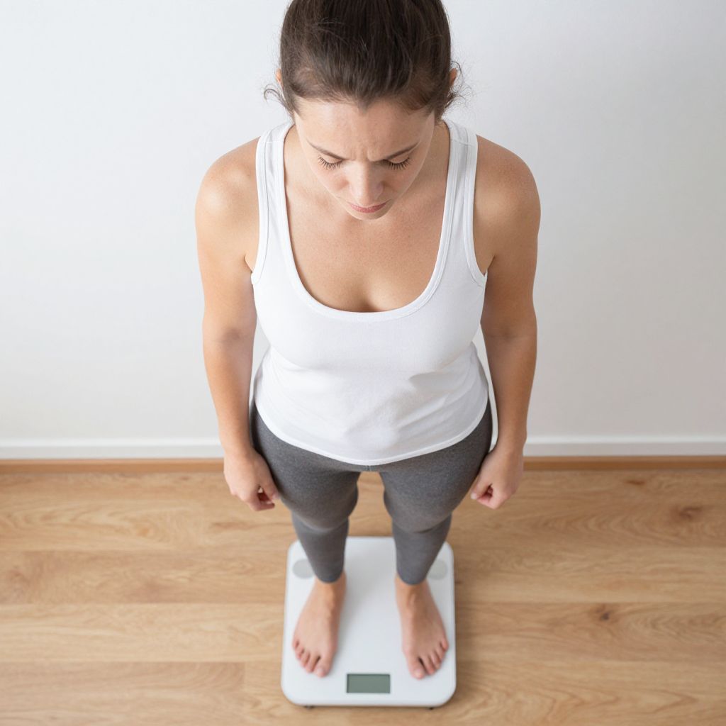 Postmenopausal woman stands barefoot on a digital scale, gripping its handle with one hand while her gaze is directed downward, suggesting contemplation or concern about her weight.