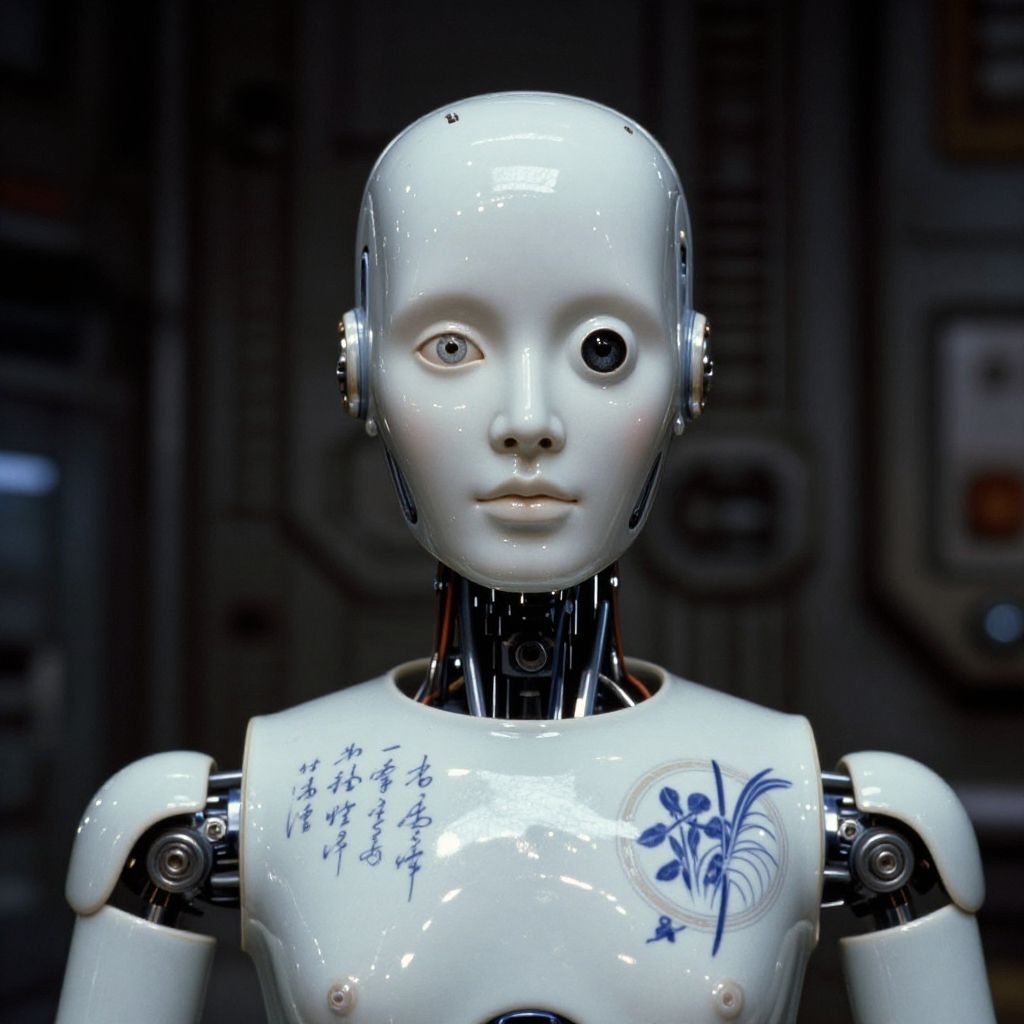 RAW, front facing, vintage 1980s film still of ([cyborg|doll] with cybernetic implants), bionic eye, (mechanical face), [glossy porcelain face], ceramic body, (glossy porcelain body), [[smooth porcelain]], (calligraphy ornament), (Ming dynasty porcelain:1.5), high frequency detail, fine details, (mechanical joints, mechanical arm, circuity, human ai hybrid, augmentations, wires, akira movie still:1.2), Detailed imposing walls of dark cyberpunk factory background, sci-fi, shallow depth of field, artificial light, (Kodak Vision 35mm film), MGM Metrocolor, F/2, (cinematic film still from Blade Runner 1982), medium closeup, upper body, soft dim lighting