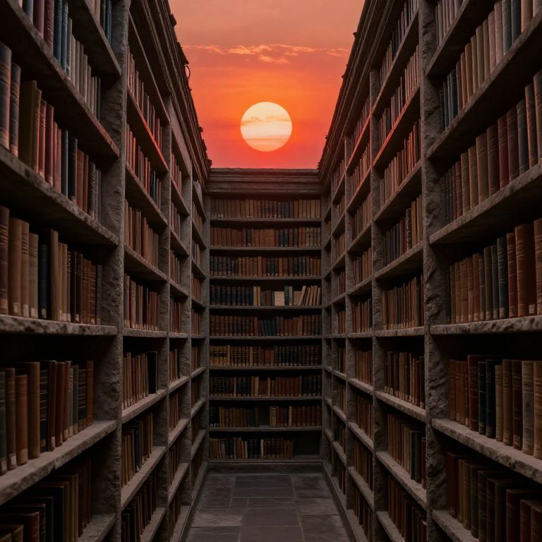 Under the crimson gaze of a blood-orange sun, a labyrinthine library of whispering stone shelves invites introspection, where ancient truths emerge from forgotten stories, and the air hums with the quiet promise of knowledge yet untold.