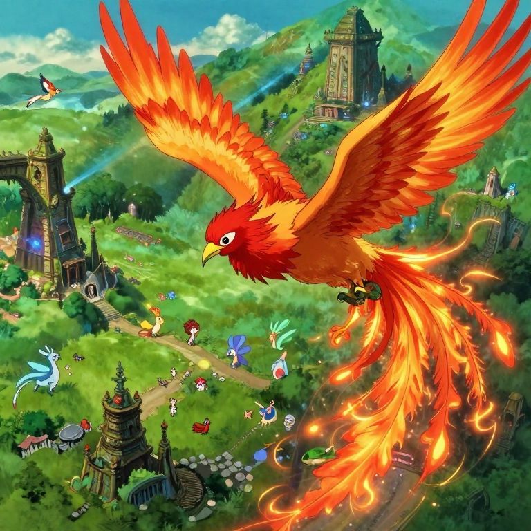 Imagine an enchanting digital art scene reminiscent of Studio Ghibli's captivating narratives, portraying a mythical landscape where a resplendent phoenix with fiery plumage soars above a verdant valley teeming with fantastical creatures and ancient ruins. This breathtaking panorama is seen from a bird's-eye view, revealing a wondrous tapestry that transcends the ordinary by blending the celestial beauty of the phoenix's flight with the earthly allure of the mystical terrain below. The scene evokes an profound sense of wonder and amazement, beckoning the viewer to embark on a mesmerizing voyage through this dreamlike realm where nature, magic, and legend intertwine in an unforgettable symphony of color, light, and imagination.