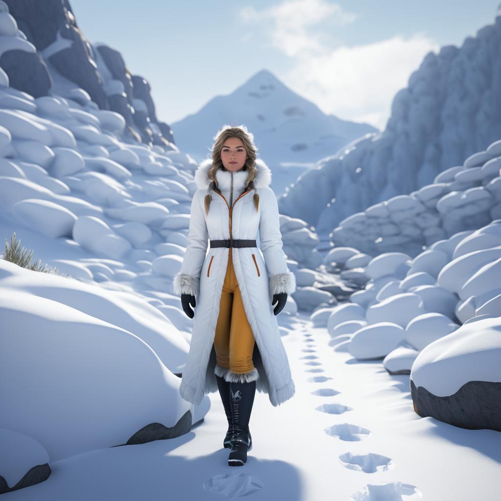 A young woman wearing a white fur-trimmed coat with a belt, fur-trimmed gloves, and boots walks along a snowy path beside a river in a mountainous winter landscape. The scene is bright with clear skies and snow-covered peaks and rocks around her. The image is rendered with ultra-realistic, cinematic detail.