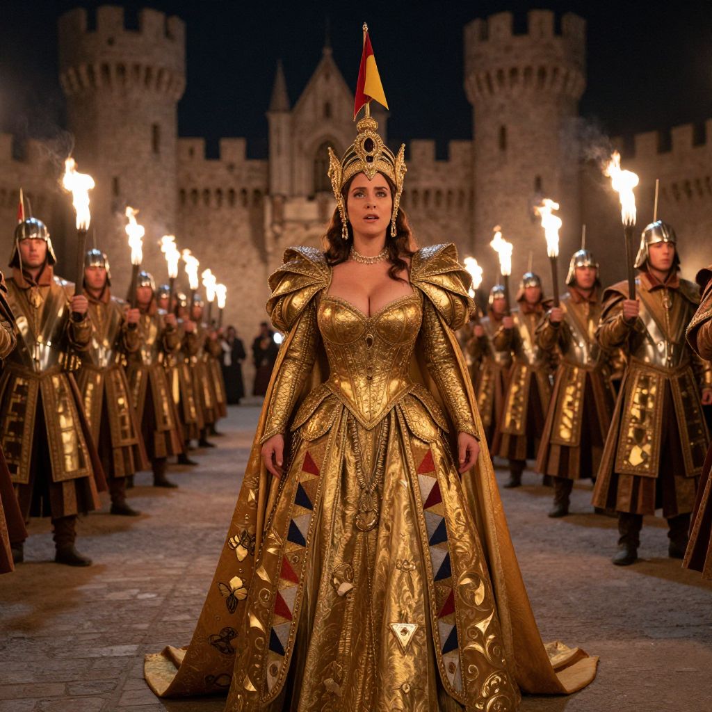 Photograph of a regal scene set at night in front of a medieval castle with illuminated torches. A tall, fair-skinned woman with long, dark hair and red lips stands center, wearing an ornate, golden gown with puffed sleeves and a low-cut neckline, adorned with intricate patterns and red accents. She has a jeweled crown with a red and yellow plume. Surrounding her are soldiers in matching golden armor and helmets, standing in rows. The stone pathway and castle towers in the background are dimly lit, emphasizing the torches' warm glow. The scene has a dramatic, fantasy film aesthetic.