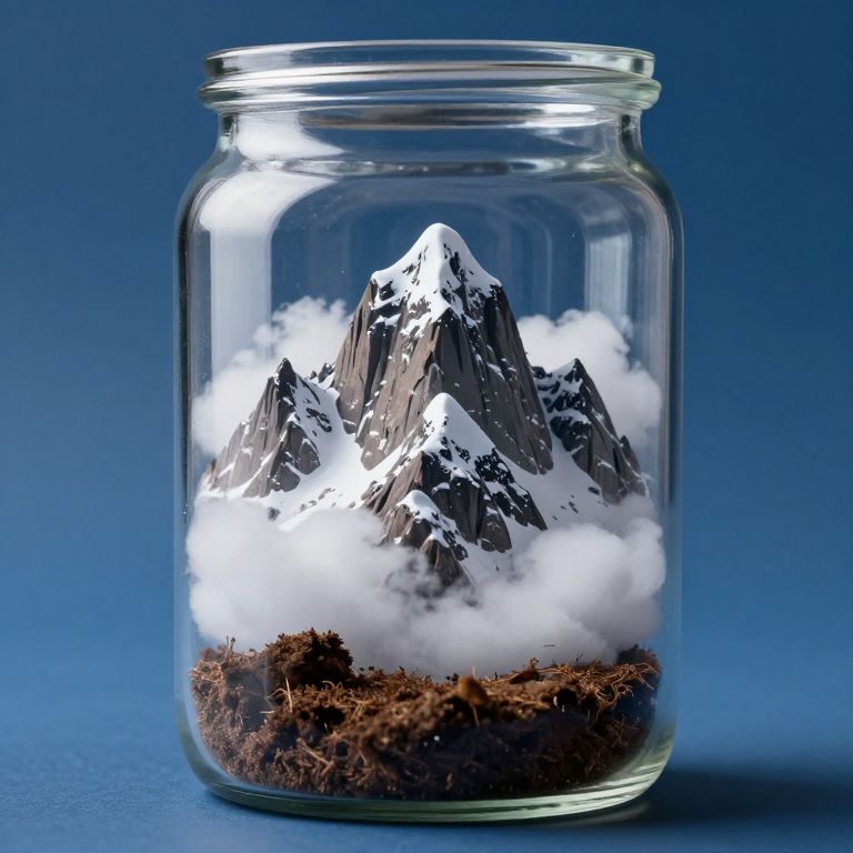 Surreal mountainscape encased within a transparent glass jar, featuring jagged peaks dusted with snow, surrounded by fluffy white clouds, and resting atop a bed of earthy brown soil, all set against a deep blue background.