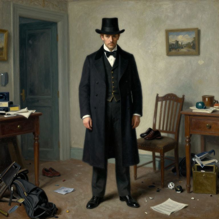 Cloning poirot standing in the middle of a messy room, whole body, wide shot, oil painting, style of Eugene Delacroix,