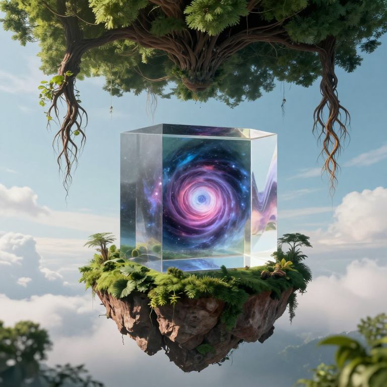 A transparent cube cradles a swirling cosmic vortex, suspended serenely above a floating island of lush greenery where trees grow upside-down, their roots piercing the sky like tendrils reaching for the heavens.
