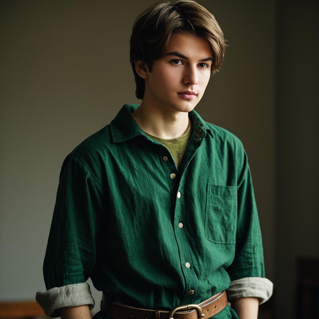 Portrait of a young male with brown hair and brown eyes wearing a Renaissance-style green shirt with rolled-up sleeves and a brown belt. The male subject has short hair, a closed mouth expression, and is standing against a blurred neutral background.