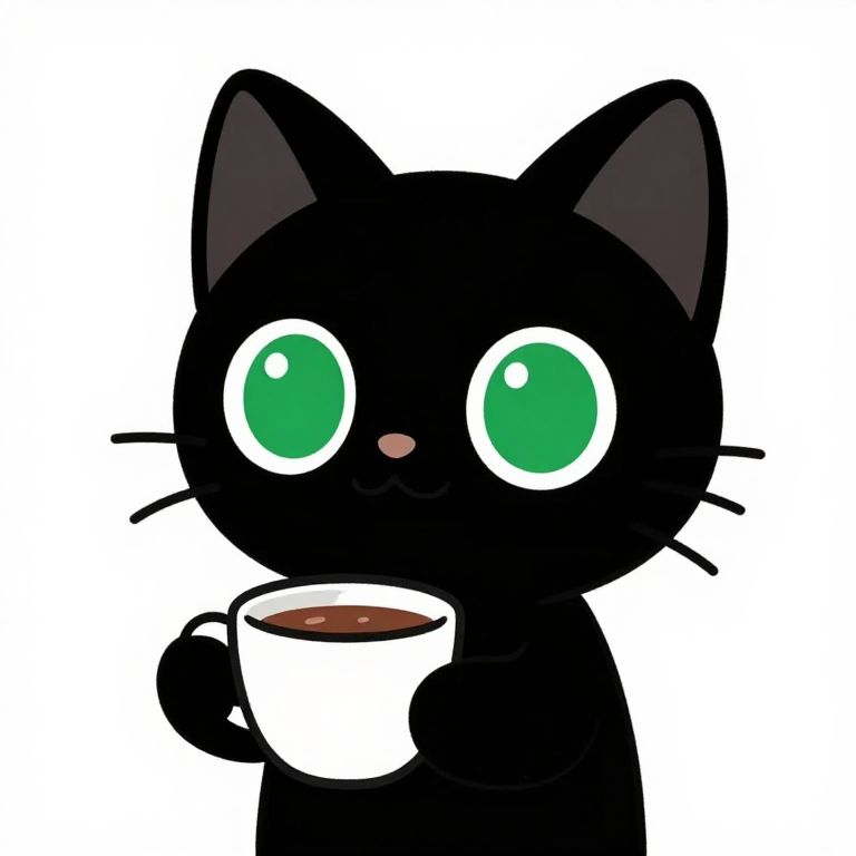 Minimalistic illustration of an adorable black cat with large green emerald eyes and a happy smile holding a white cup filled with hot chocolate against a white background.