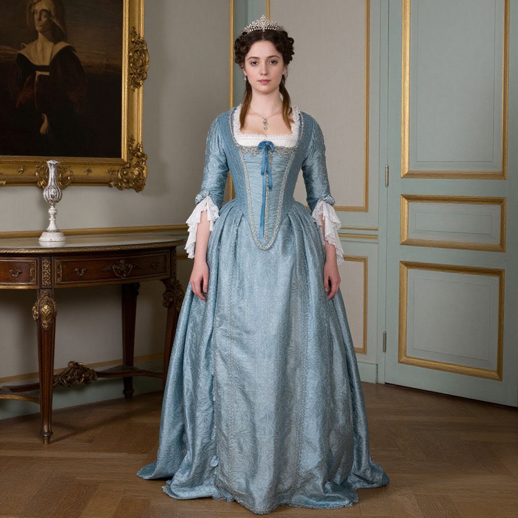 Photograph of a woman standing in an elegant, classical room. She wears a light blue, full-length, Renaissance-style gown with a white lace collar and cuffs, and a blue ribbon at the center. Her dark brown hair is styled in an updo, adorned with a silver headpiece. The background features a wooden side table with an ornate silver lamp and a large, framed, dark portrait of a man in period attire. The walls are painted light blue with gold trim, and the floor is wooden. The woman's expression is neutral, and her posture is straight, emphasizing the elaborate details of her attire.