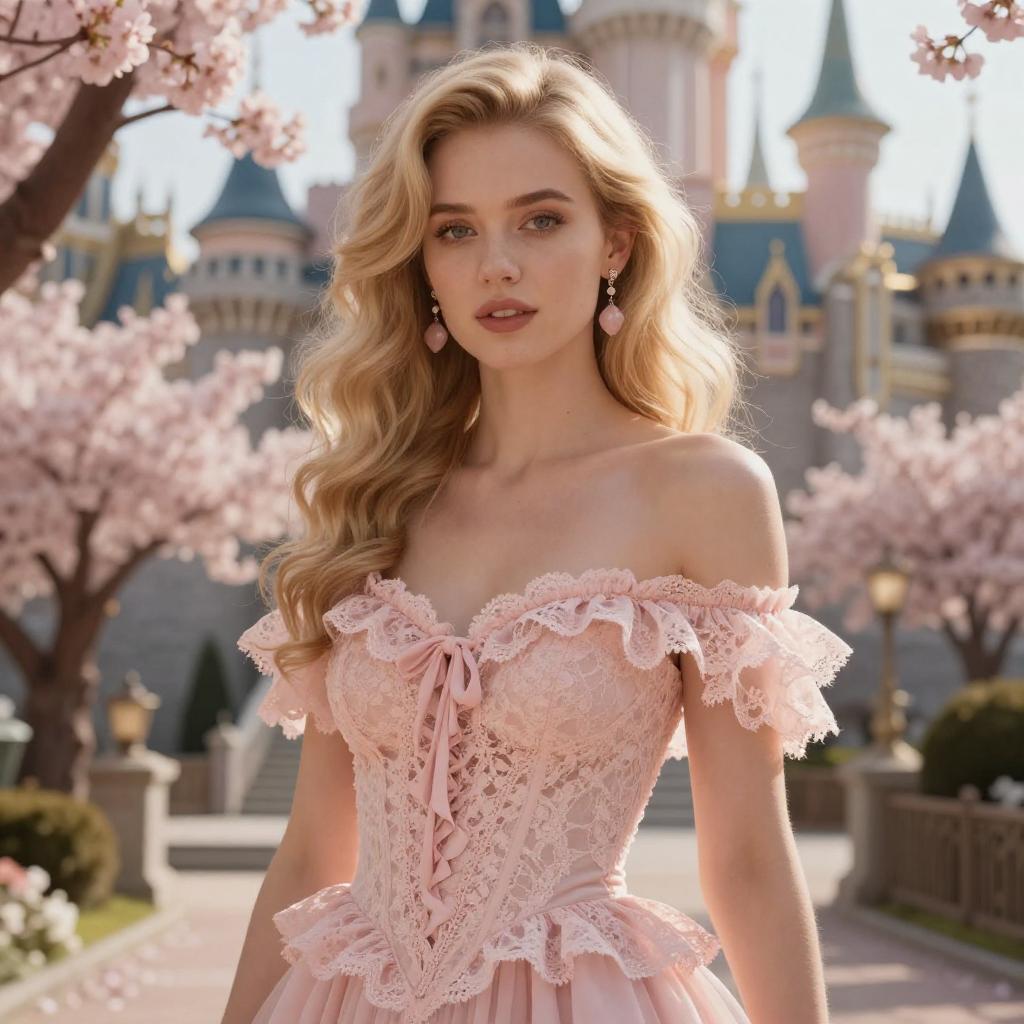 Digital art of a beautiful blonde woman with wavy hair, wearing a pink, lacey, off-shoulder dress with ruffles. She's standing in a fantasy setting with pink cherry blossom trees and ornate, castle-like structures in the background. The lighting is soft and warm, highlighting her fair skin and pink earrings. The camera angle is slightly above eye level, and the background is slightly blurred, creating a shallow depth of field.