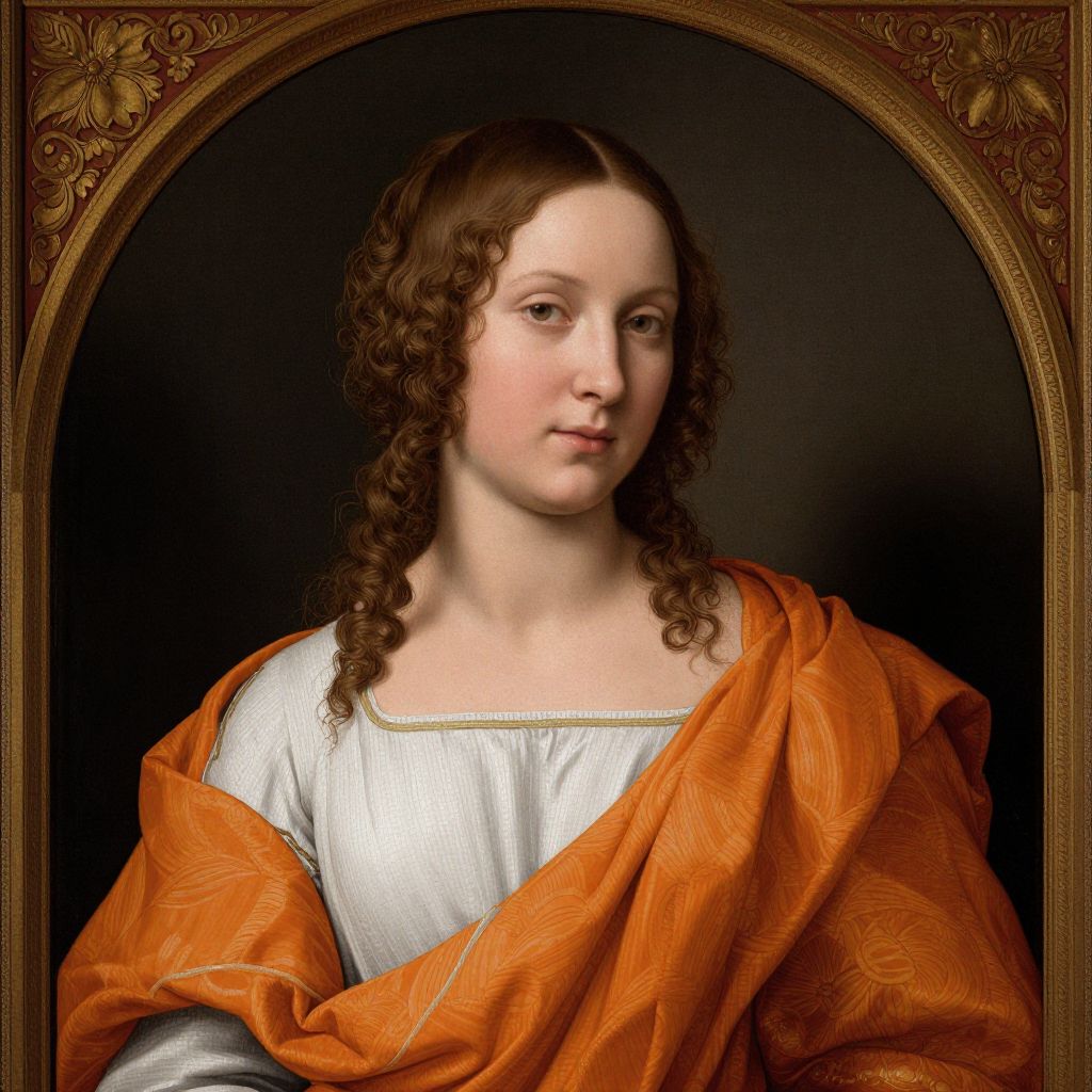 Classical portrait of a woman with curly brown hair styled in a braid, wearing a white undergarment and an orange robe, framed in ornate detailing, reminiscent of Renaissance artistry.