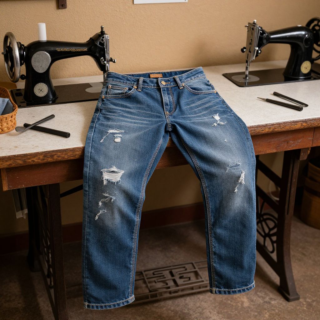 Photograph of a wooden sewing table with two black vintage Singer sewing machines flanking a pair of distressed blue jeans, featuring multiple white rips and fading. The jeans are centered on the table, with a wicker basket to the left and a black sewing knife to the right. The background includes a beige wall and a tiled floor with a decorative metal grate. The image has a warm, natural light, highlighting the textures of the denim and wood.