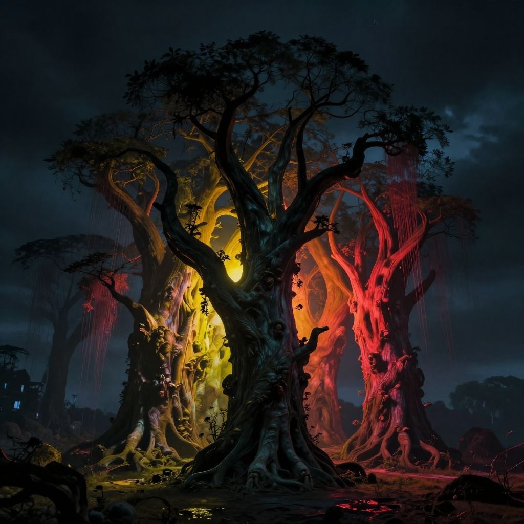 Digital artwork of a dark, stormy night featuring three massive, twisted trees with gnarled roots. The central tree glows with a bright yellow light, while the left tree emits an orange hue and the right tree glows red. Rain drips from the trees' branches, illuminating the dark, misty background. The trees' bark appears rough and textured, adding to the eerie atmosphere. The composition uses dramatic lighting and vibrant colors to create a striking, otherworldly scene.