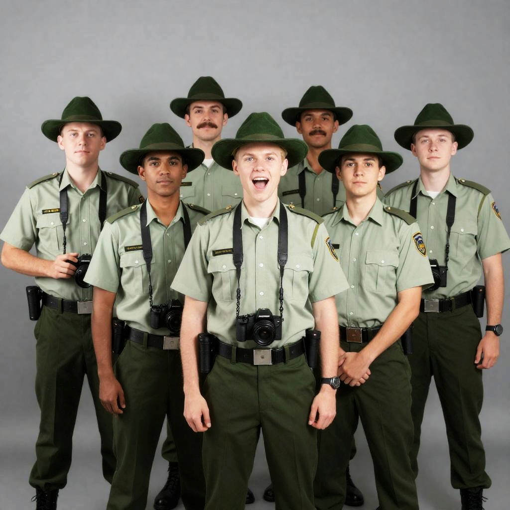 Photograph of six male park rangers in uniform, standing in a row. Five rangers in front, one ranger in back. All wear green hats and light green shirts with dark green pants. Front center ranger has blonde hair, open mouth, holding a camera. Other rangers hold cameras or a hat. Gray background. Front rangers smile or have neutral expressions. Rear rangers have mustaches. Casual, friendly pose.
