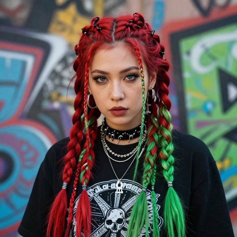 Portrait of a person with half red half green hair, intricate braids intertwining the two colors, edgy streetwear outfit, graffiti wall in the background, rich contrasting shades, vivid and sharp focus, modern artistic vibe blending punk and fantasy elements